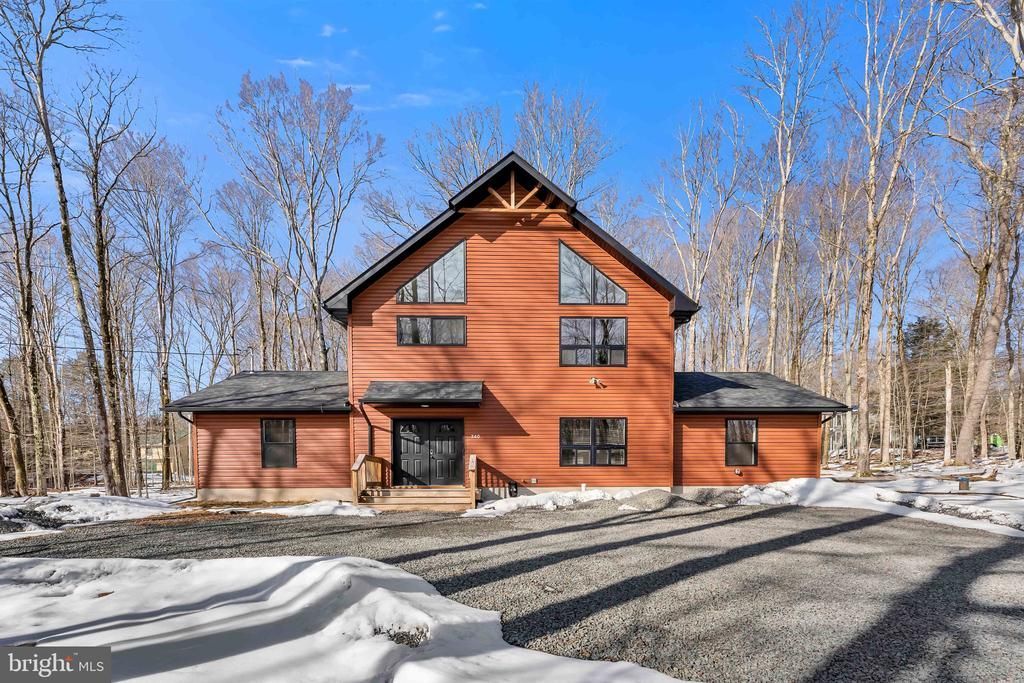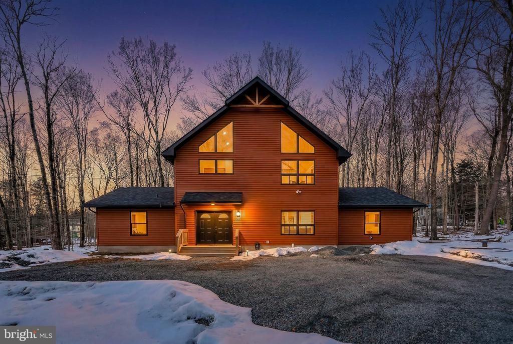 Welcome to Camelot Forest Conservation Preserve, where peaceful mountain living meets modern custom design. Built in 2022, this stunning custom two-story home showcases exceptional craftsmanship, thoughtful upgrades, and luxurious touches throughout. Step onto the spacious front porch and enter a bright, welcoming foyer filled with the fresh warmth of natural wood. The main level features a private primary suite complete with its own cozy fireplace and a beautifully designed spa-style bathroom with a soaking tub and separate shower complimented with a rain style shower head. A convenient laundry room off of the foyer and custom ski-style coat rack in the foyer add the perfect touch for Pocono living. Continue through the foyer into an expansive family/game room--an ideal space for entertaining or relaxing. From here you'll find access to the lower deck, additional bedrooms, a guest bathroom, and even a private custom sauna, creating the perfect retreat after a day enjoying the outdoors. Upstairs, the home opens into a breathtaking living space featuring cathedral ceilings, a warm fireplace, and dramatic chalet-style windows that flood the room with natural light while showcasing the surrounding forest views. Sliding glass doors lead to a large second-floor deck perfect for grilling, entertaining, or simply relaxing with a good book while enjoying the peaceful wooded surroundings. The open-concept kitchen is designed to impress with custom cabinetry, quartz countertops, floating display shelving, stainless steel appliances--including a stainless steel refrigerator and dishwasher--and a spacious breakfast bar. The adjoining dining area easily accommodates a 12-person table, making this home perfect for gatherings with family and friends. Large windows throughout the kitchen and dining areas allow you to enjoy views of local wildlife including deer and other forest visitors. Additional features include luxury vinyl plank flooring throughout the home with carpeted bedrooms, custom lighting fixtures, abundant storage, and multiple outdoor living spaces designed to fully enjoy the beauty of Camelot Forest. The home also features a large gravel driveway with parking for approximately 6-8 vehicles and a Level 2 EV charger. Located in a short-term rental friendly community, this property offers excellent flexibility for owners and investors alike. This remarkable custom home offers the perfect combination of modern comfort, thoughtful design, and natural Pocono surroundings. A must-see property for buyers seeking something truly special.